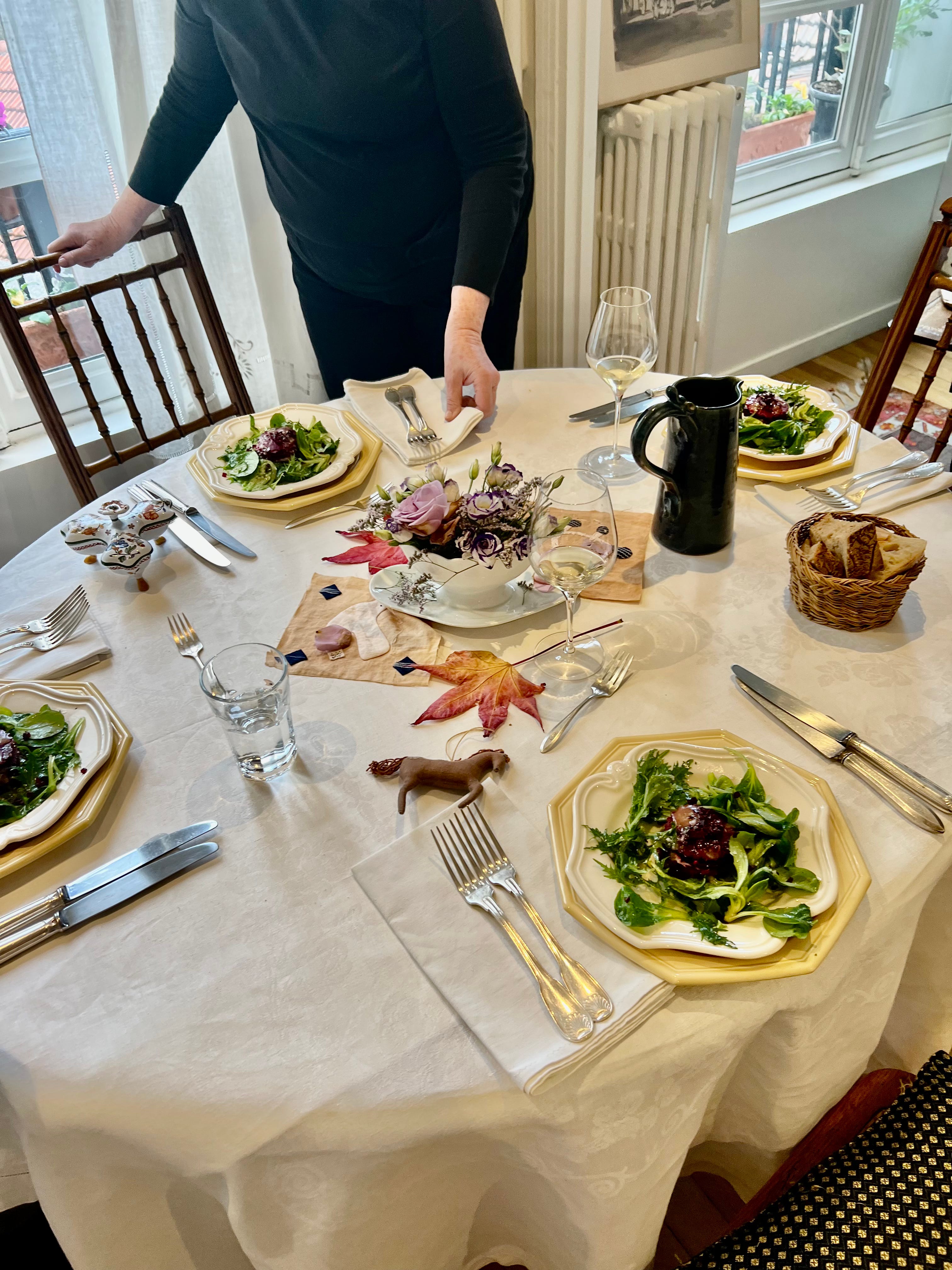 Mise-en-place done, the table is set, recipes are printed, aprons and tea towels are at the ready so that when everyone is assembled, we begin immediately. I offer a tasting or two, then dishes are either chosen or assigned, sometimes more than one person on the same dish. And we begin. Those preparing a dish owning it from A to Z, though I’m right there to adjust a hand on a knife, give a tip on how to get there faster or easier, lend a hand, tell a story that makes the dish even more special. There is much conversation and laughter, so many delicious aromas and kitchen alchemy, then Voila! We are hungry and the meal is ready.
