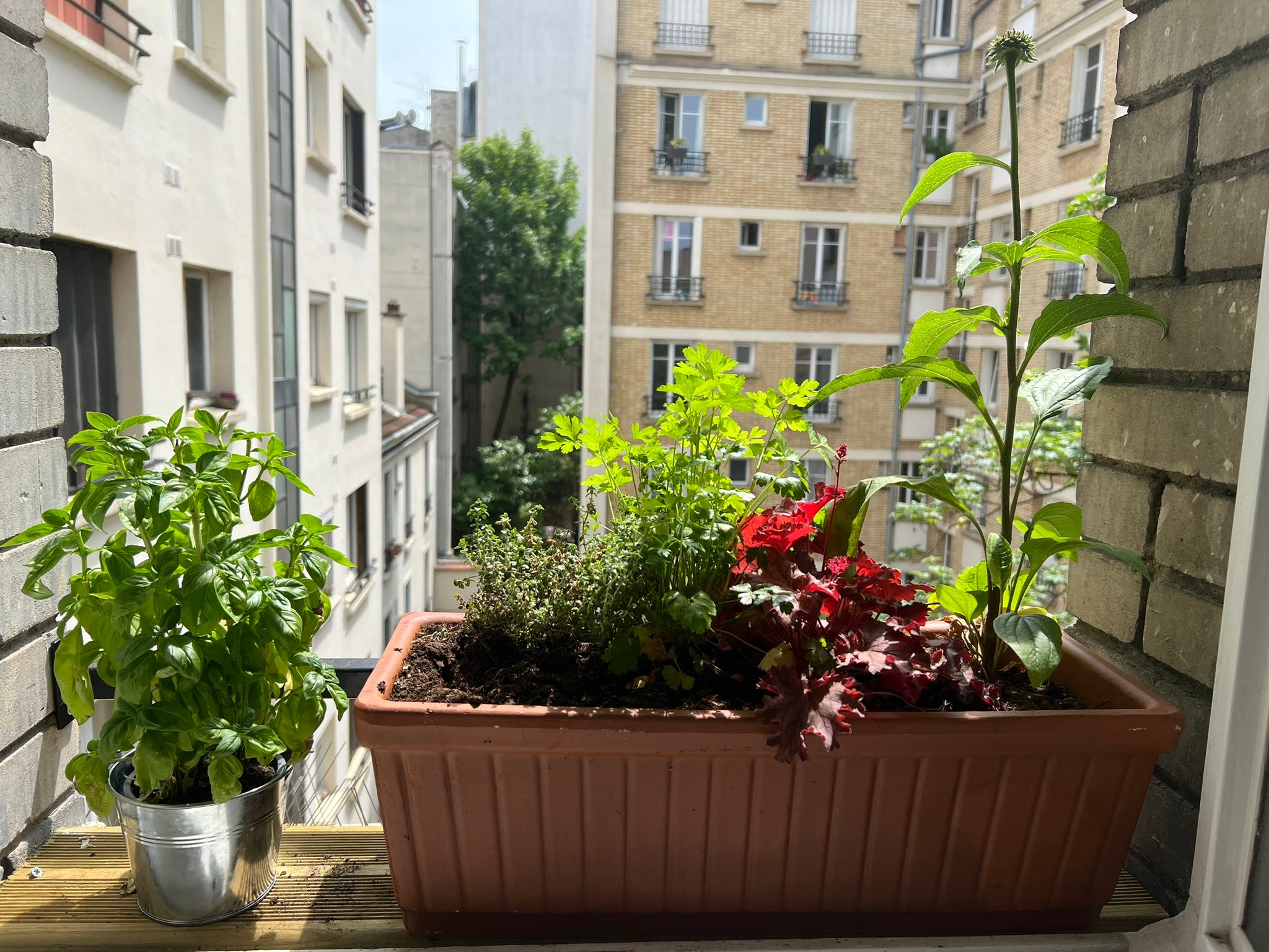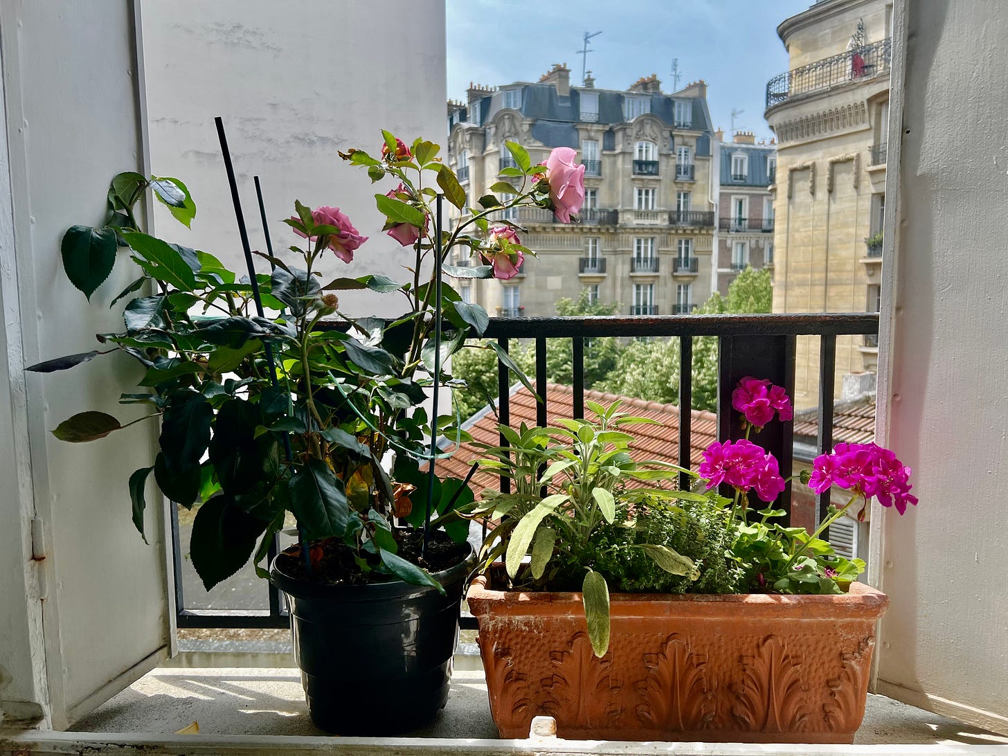 And while I don’t have my charming and productive garden, my window boxes come a close second. I’ve got gorgeously scented roses, thriving basil, sage, flat-leaf parsley, lemon and English thyme, and a bay tree that, though miniature, will soon produce leaves I can tuck into all my dishes. For now, robbing it feels like taking toys from a baby, so I am being patient. As for plate décor, geranium petals take care of that.