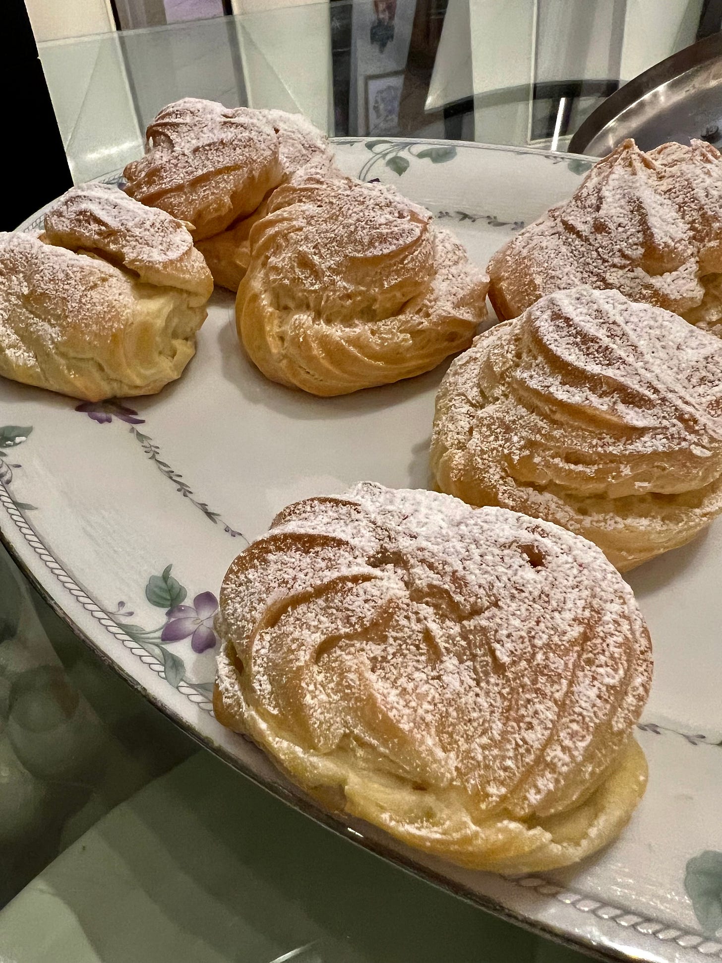 We left sated and happy, to arrive at the Georgian home where Joe’s prediction came true. We were enveloped by three generations of the family who live there, shown to the table which had a platter of freshly made, giant choux pastries on it. Tea was poured, wine and whiskey were offered, and a platter of hot from the griddle khatchapuri were brought in as one by one family members returned from their late-night jobs to join us so that soon, it was a big party with children running in and out. I now know that as in France where there is always room for cheese, so in Georgia (Texas), there is always room for choux and khatchapuri and the loving warmth of a big, Georgian family.